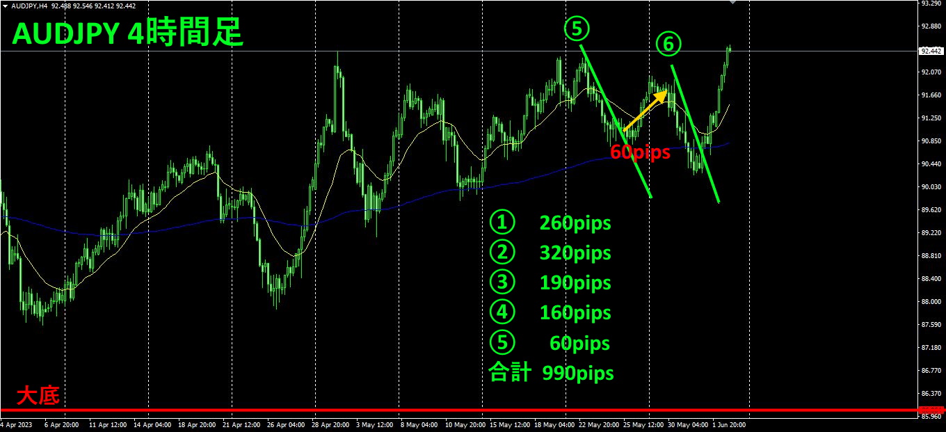 「斜め切り下げラインを、上抜けしたら買い」というシンプルなトレードを繰り返すだけで①から⑤の合計で約990pipsの利益が得られました。現在は、⑥のラインを引いて買いポジションを建てていますので、含み益が190pips程になっています。