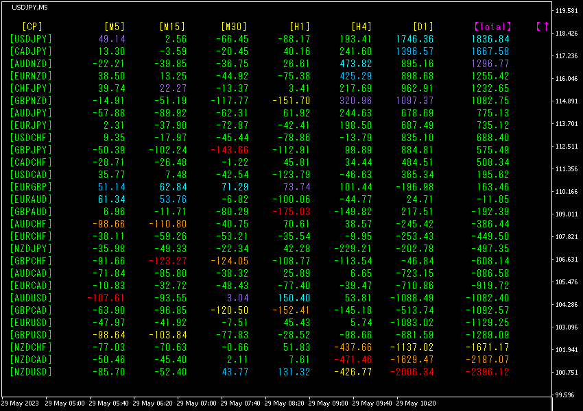 Total数値の降順に並び替えています。どの行を見ても、数字のカラーが揃っていません。数値の絶対値も小さいので、どの通貨ペアにおいても、トレンドが発生していないことが明らかです。このような相場環境の時は、トレードをしないという賢い選択をしてください。