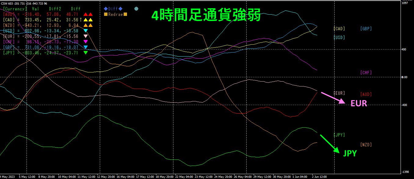 EURは上向き、JPYは下向きです。通貨強弱としては、EURが強く、JPYが弱いです。今後もEURJPYの上昇傾向が続くと考えられます。