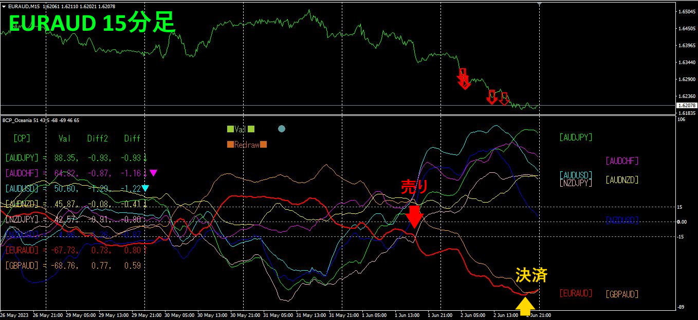 木曜日にEURAUDが他のグラフ群を下抜けしてきたので売りエントリーし、金曜日の夜に決済しました。約150pipsの利益になりました。