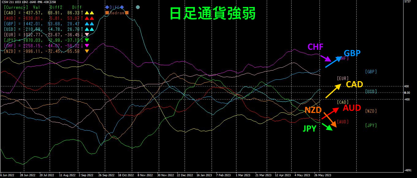 CAD、AUD、GBPが上を向いています。一方、NZD、CHF、JPYは下を向いています。
