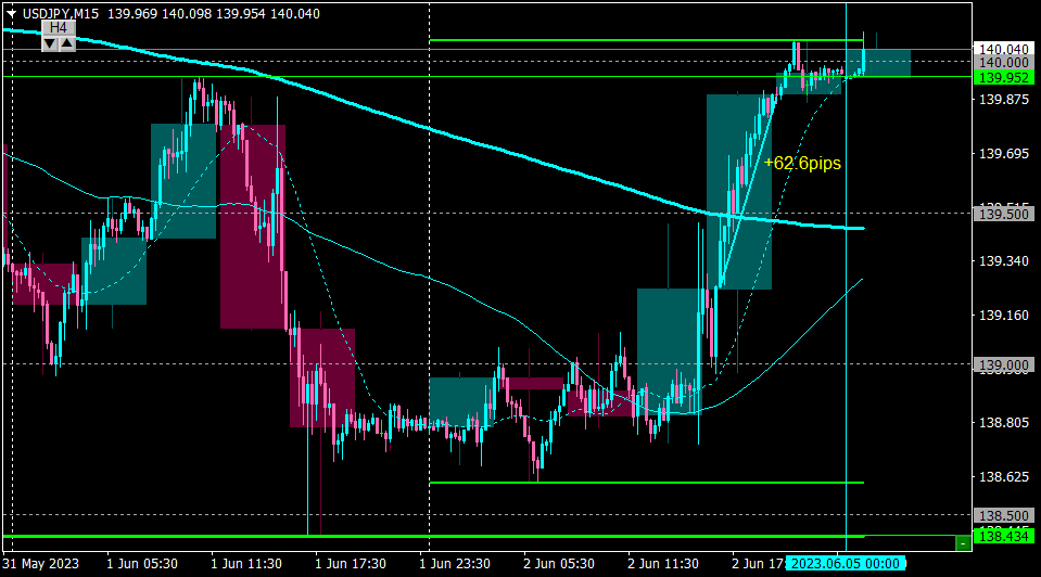 H4の足の完成でイグジット。+62pips