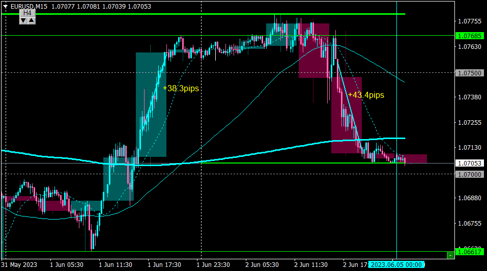 H4の足のクローズでイグジットした。+43pips