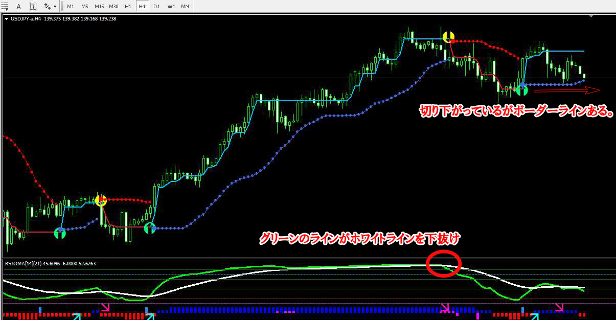 このダブルトレンドフォロー・・は、サブチャートのラインとヒストグラムで判断する事により判断する事が出来ます。