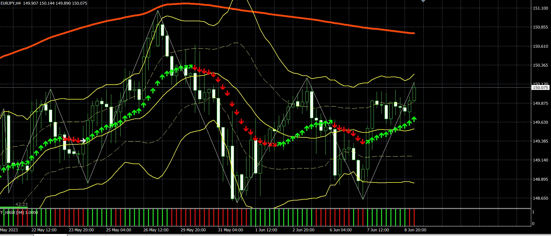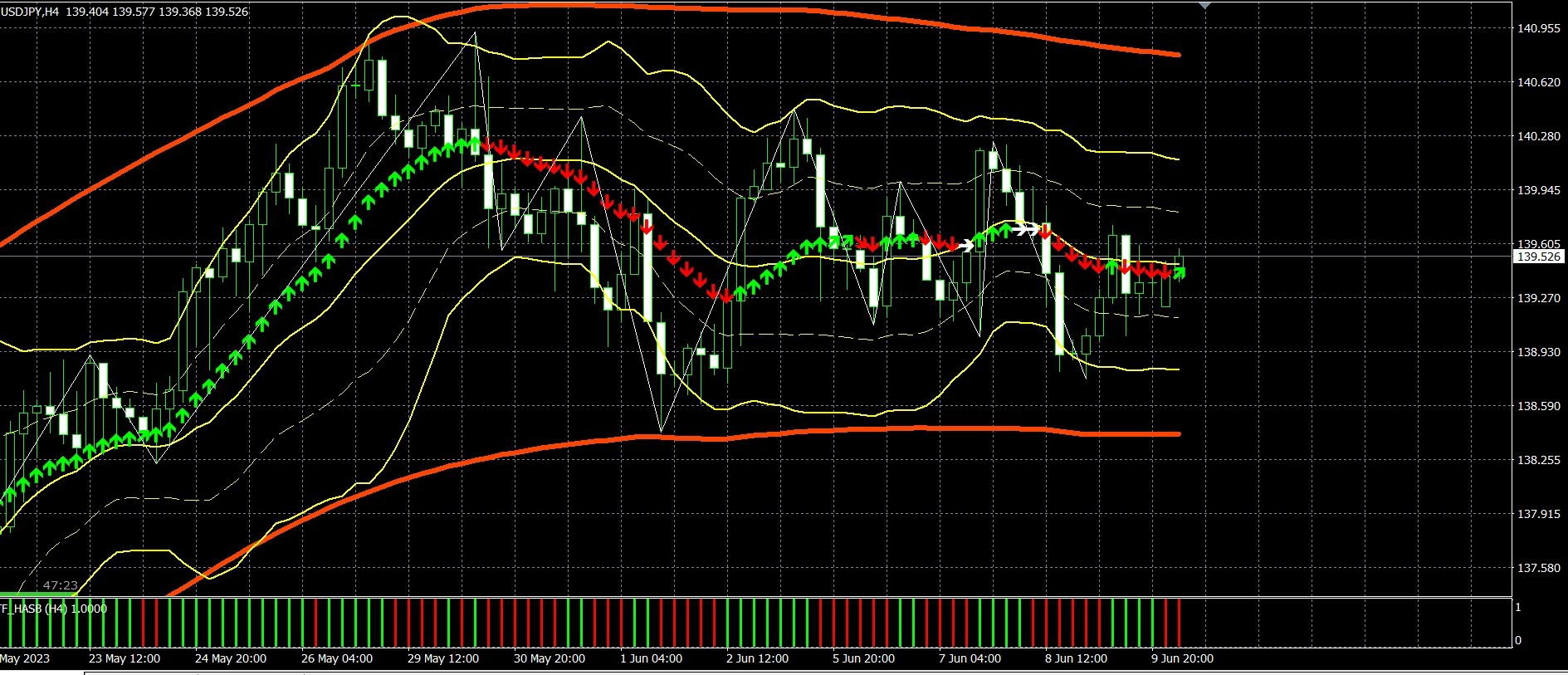 ドル円は買いポジションがリミット141.00を達成し+95pipsとなっております。豪ドル円は買いポジションを昨日4時間足18時の終値95.75で決済し+40pipsとなっております。