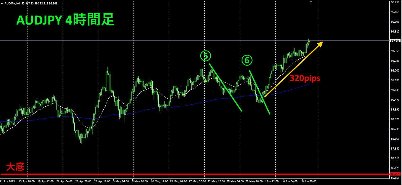 「斜め切り下げラインを、上抜けしたら買い」というシンプルなトレードを繰り返すだけで①から⑤の合計で990pipsの確定利益が得られましたが、さらに⑥のライン上抜けから買ったので、含み益が320pipsになっています。
