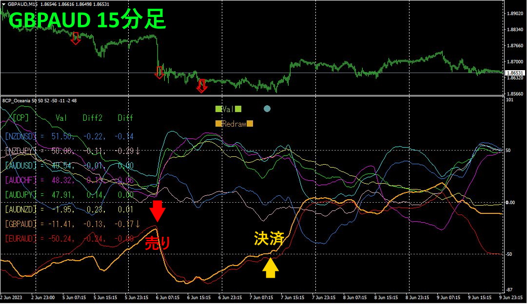 上半分は、GBPAUDの15分足チャートです。上半分の矢印は、「28通貨ペア一覧インジケータ」のアラート位置を示します。下半分は、「8CP見える化インジケータ」によるものです。橙色太線のグラフがGBPAUDに相当します。