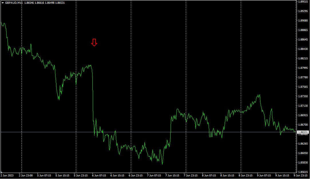 赤色の矢印がスクリーンショットを撮影した所です。下降トレンド途中の急落を捉えています。ここまで急落しているのは、指標発表などがあったからだと考えられます。カレンダーを後から見ると、RBA(オーストラリア準備銀行)の政策金利発表(0.25%利上げ)がありました。
