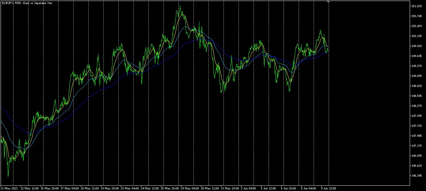 ピンク色がEUR、緑色がJPYです。EURもJPYも下向きです。角度としては、ほぼ同程度です。しばらくはEURJPYはレンジ状態で推移するものと考えられます。