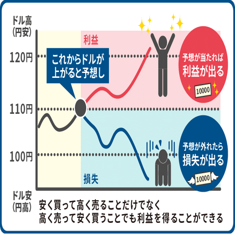 101円の上昇した場合は差額の「1円」が損失となり、逆に99円に値段が下がった場合は、差額の「1円」が利益となります。