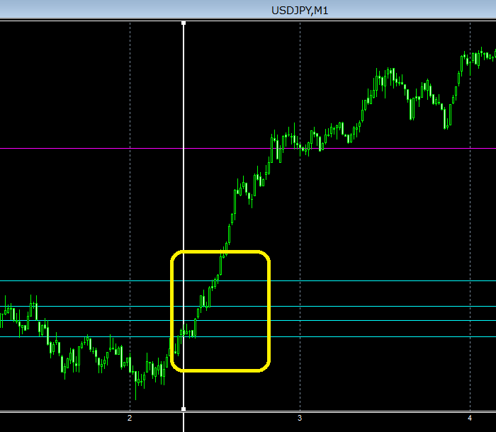 億トレーダーのスキャルピングユーザーの方は、チャートをよく見て頂ければ、何を言っているのか、容易に判断がつきます。