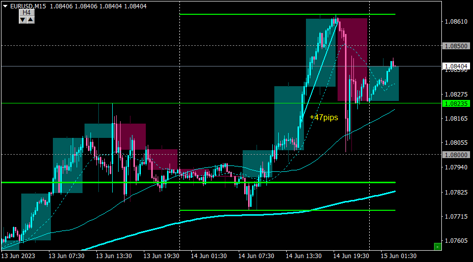 この上昇トレンドの押し目買いは、深夜のFOMC前にイグジット。+47pips