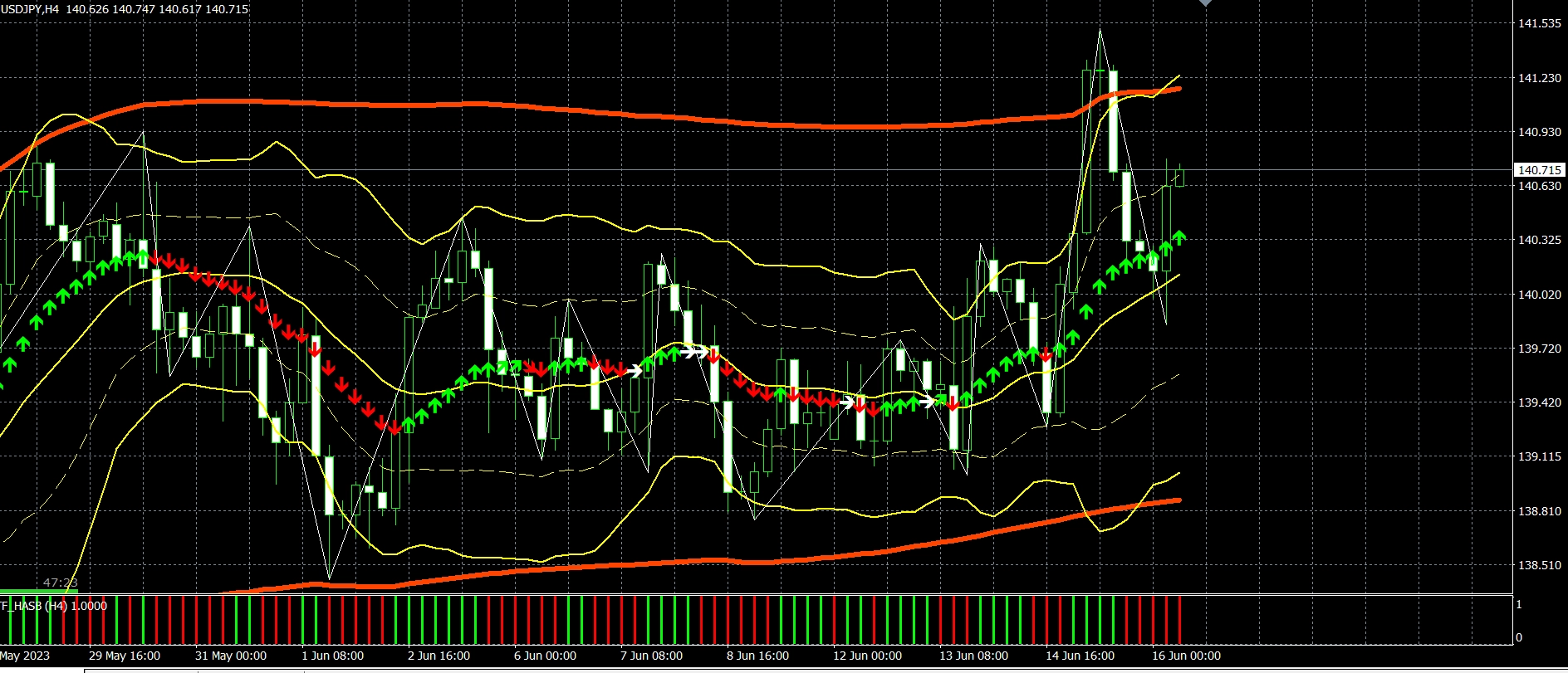 ドル円は買いポジションがリミット141.00を達成し+95pipsとなっております。豪ドル円は買いポジションを昨日4時間足18時の終値95.75で決済し+40pipsとなっております。