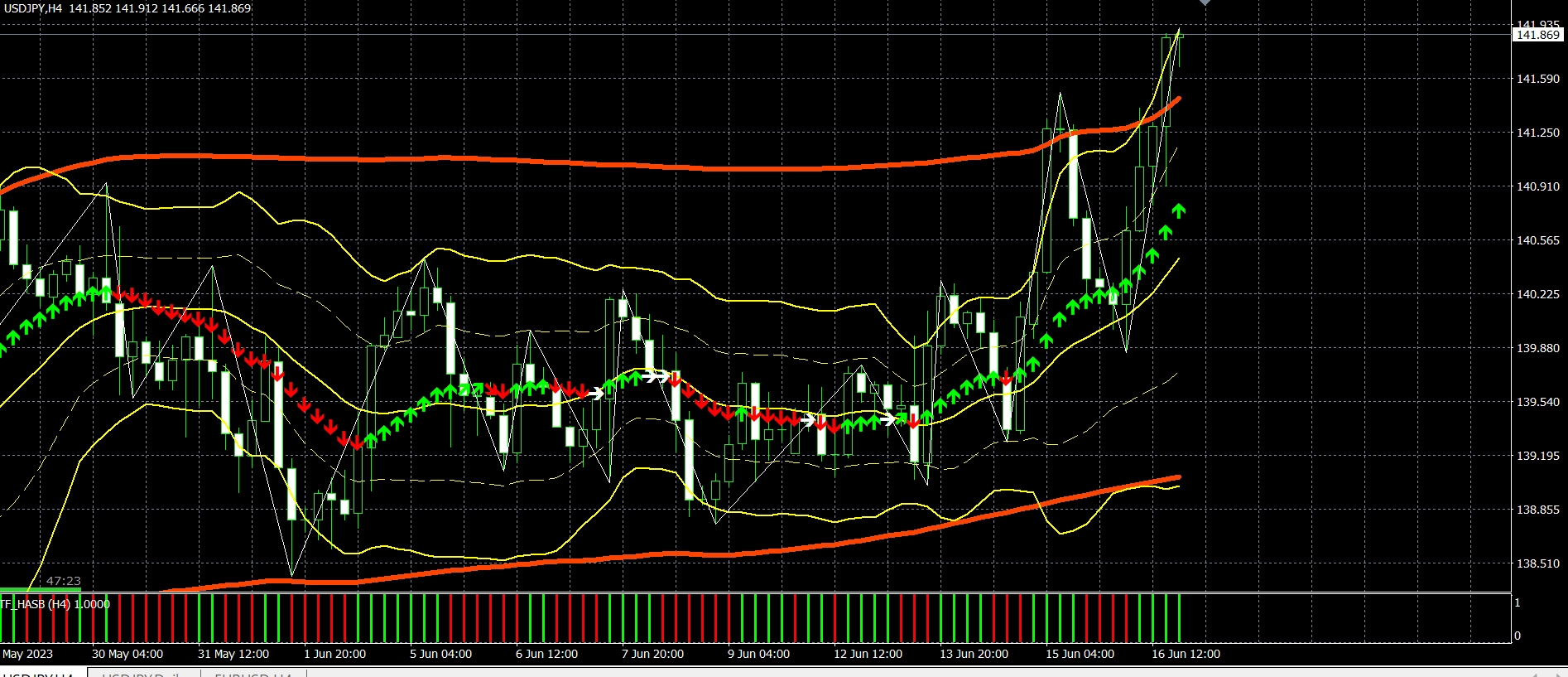 ドル円は買いポジションがリミット141.00を達成し+95pipsとなっております。豪ドル円は買いポジションを昨日4時間足18時の終値95.75で決済し+40pipsとなっております。