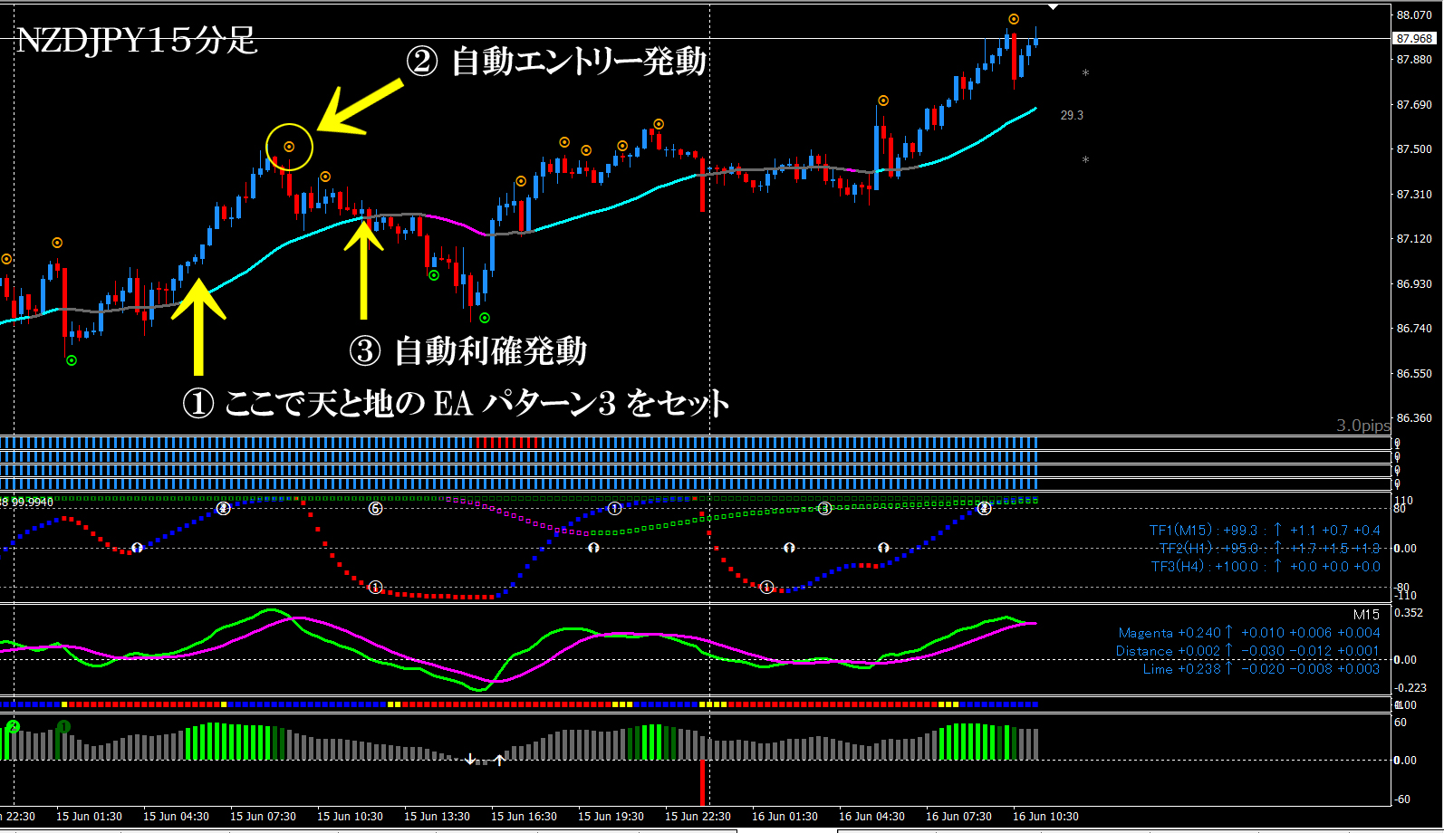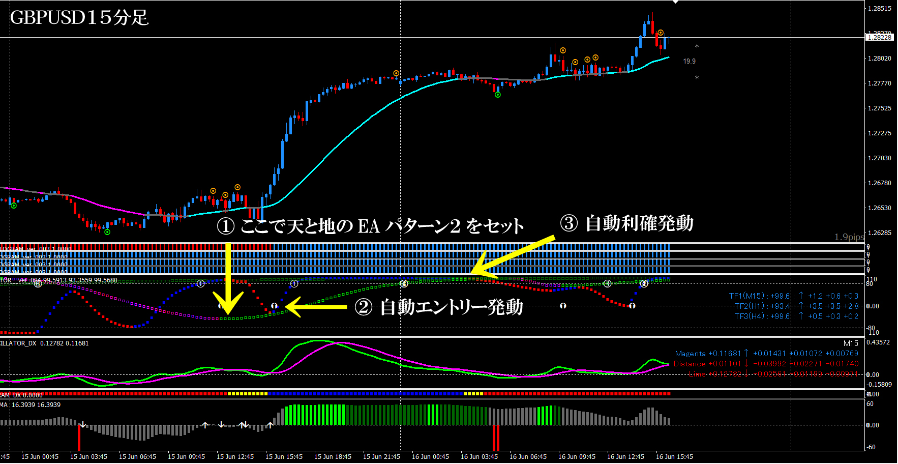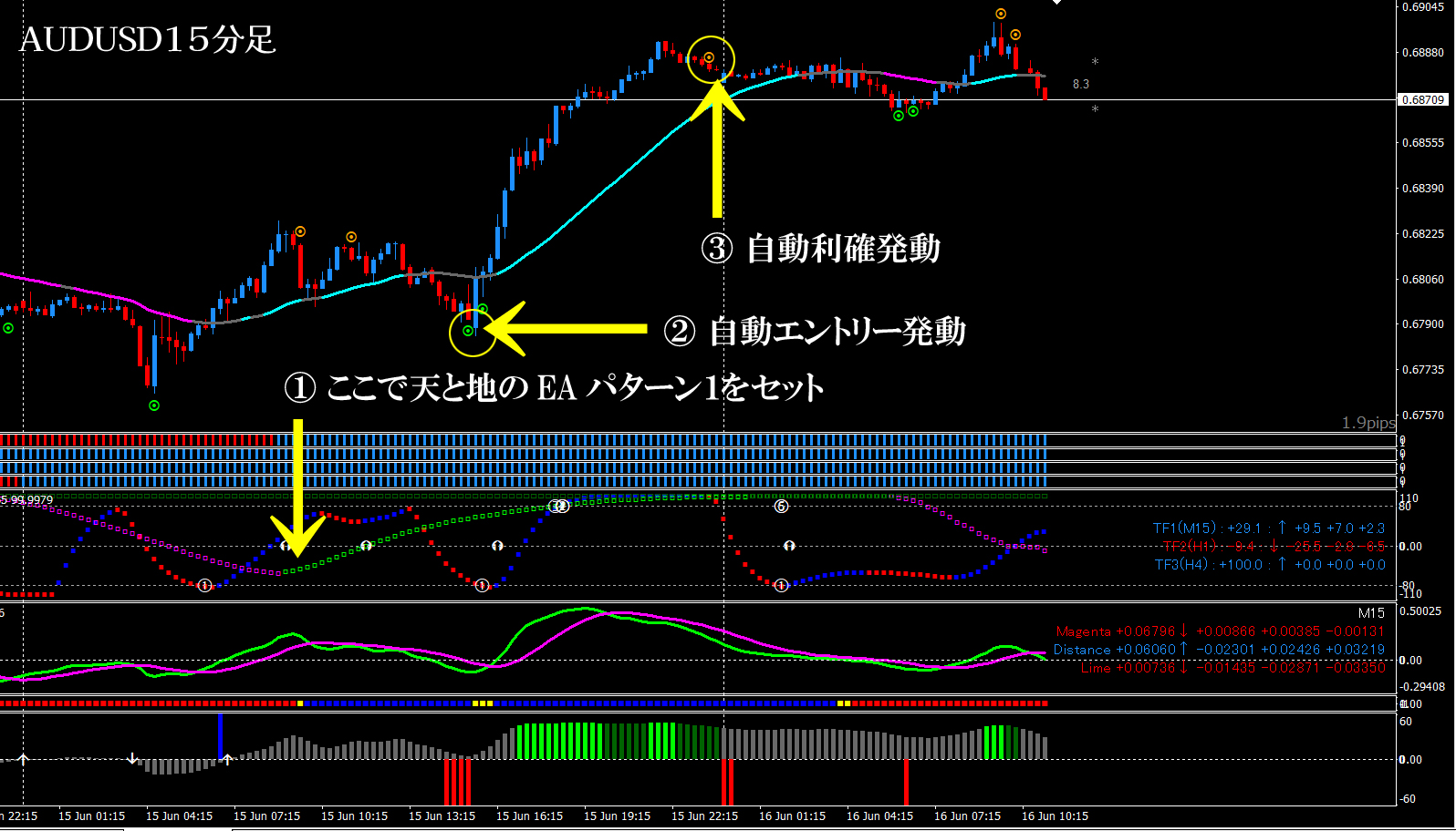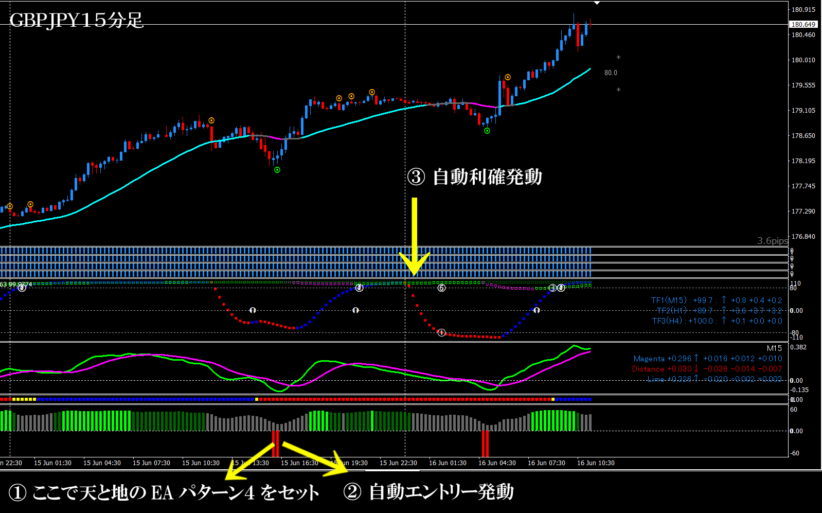 ※本EAは天と地のインジケーターをベースに使用したEAとなっているため、本体の天と地のインジケーターをお持ちでないと作動しません。