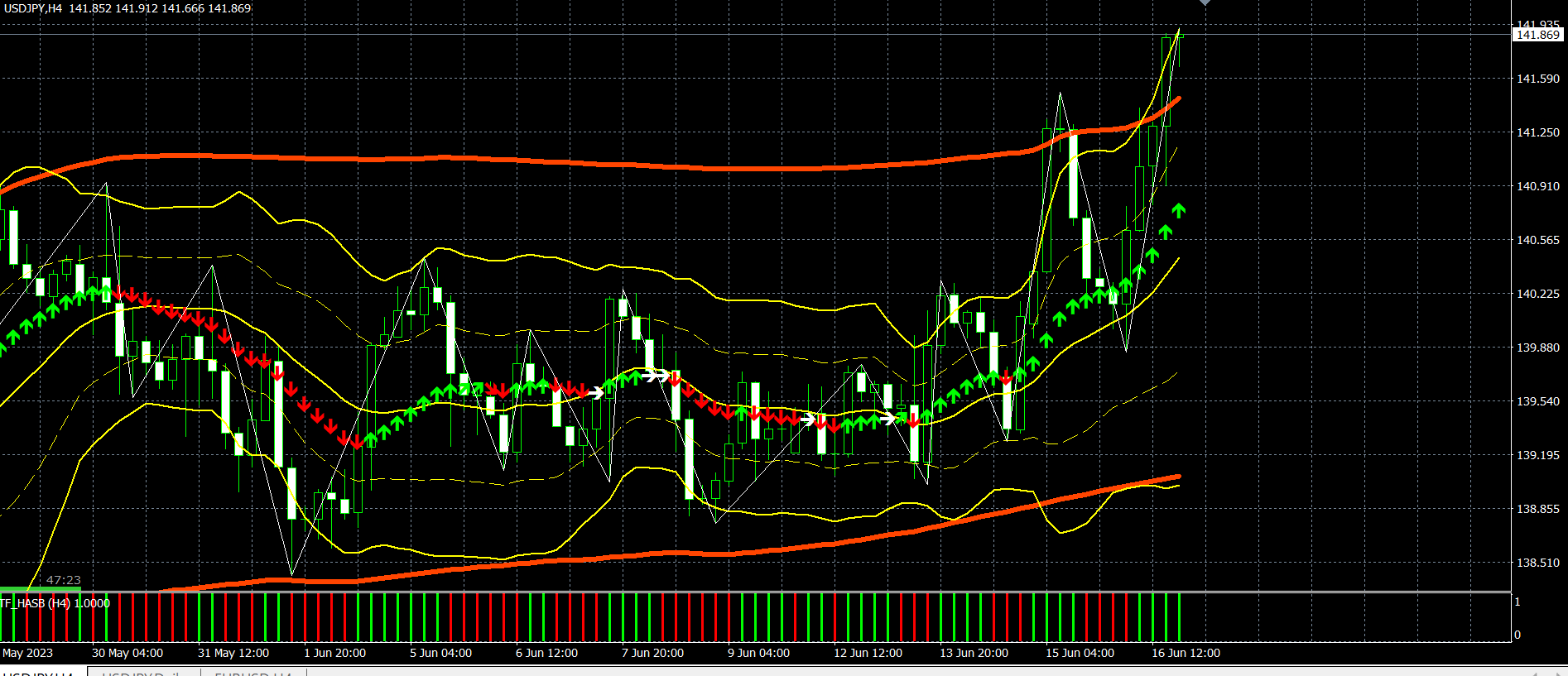 今朝6時に4時間足終値141.85で決済し+100pipsとなっております。