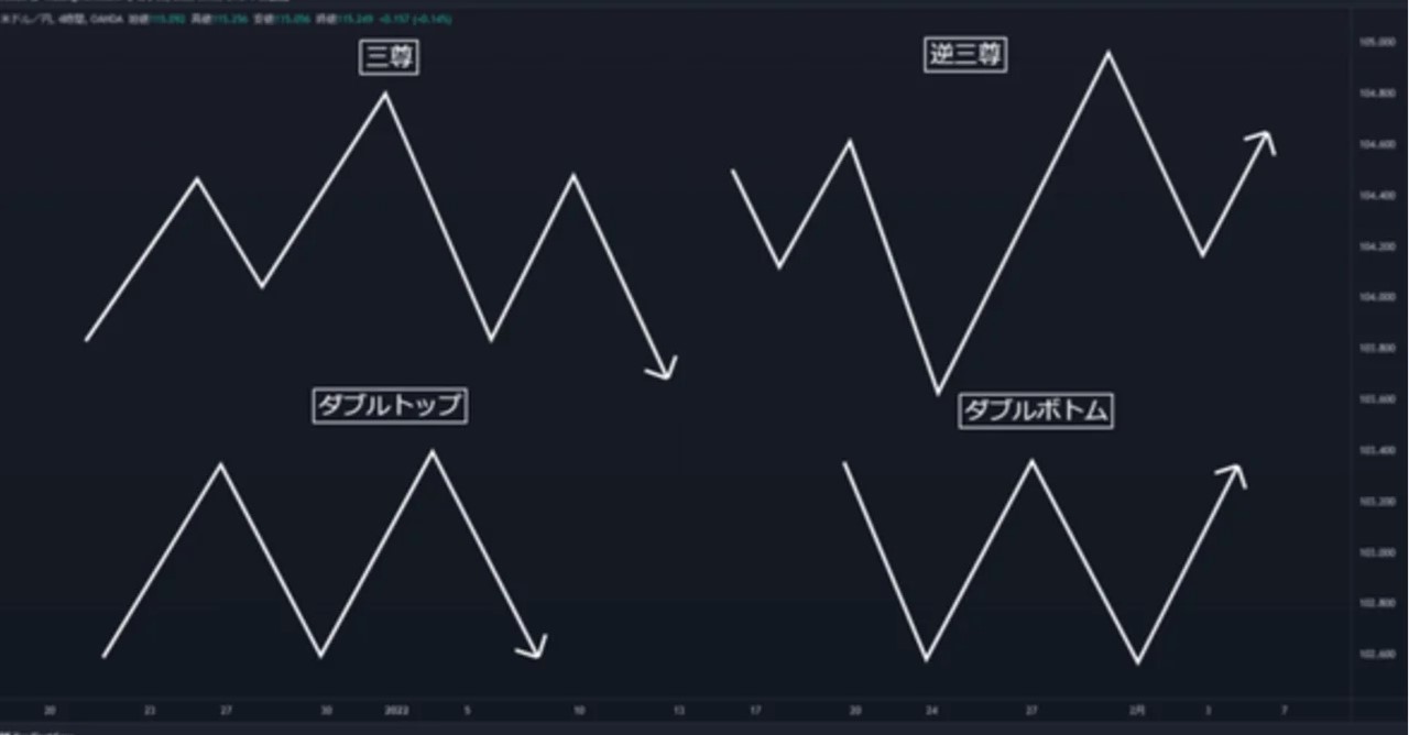 では「チャートの形やその特徴」の項目は「三尊」・「逆三尊」・「ダブルトップ」・「ダブルボトムでした。
