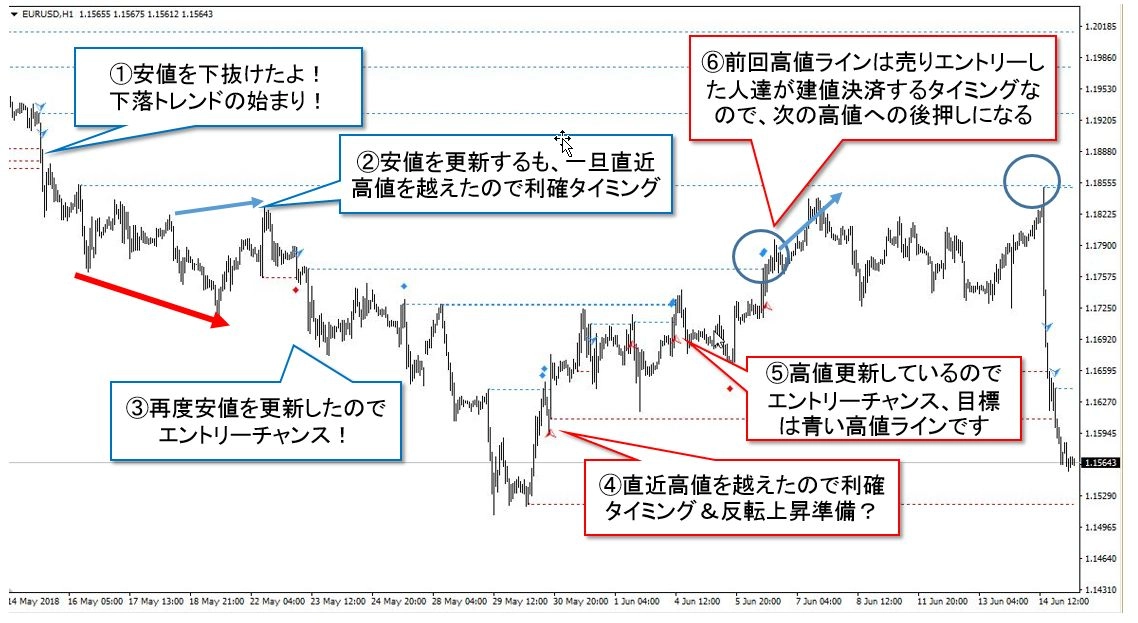 トレンド方向に複数順張りすることでトータルでの利益を目指します。