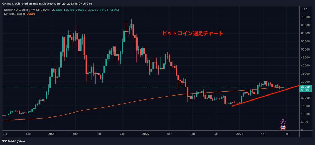 週足チャートを見てみると、200日移動平均線上で価格が踏みとどまっている上に見えます。