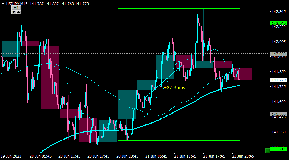 朝のシナリオ通りロングエントリーしたが、142.0付近で上げ止まったのでイグジット。+27pips