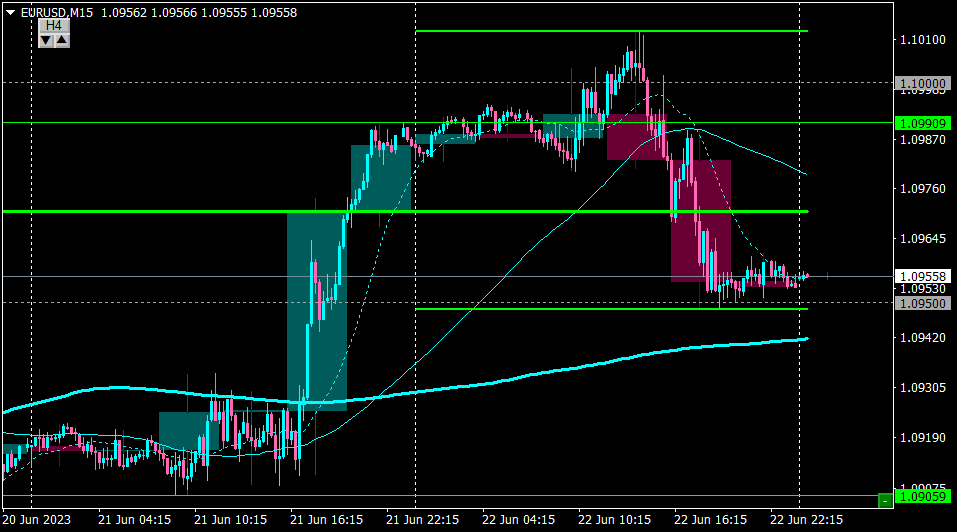 〇前日のトレード・USDJPY ドル円(15分足)昨日は先週安値141.50付近での値動きにとどまったためノートレード。・EURUSD ユーロドル(15分足)昨日は1.090付近でのプライスアクション