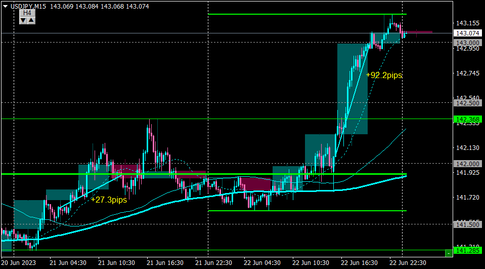 昨日はサポートになるH4MAを一時割り込んだが、買いが強く再びサポートされた後、想定していたレジスタンス142.0を上抜いたタイミングでロング。+92pips