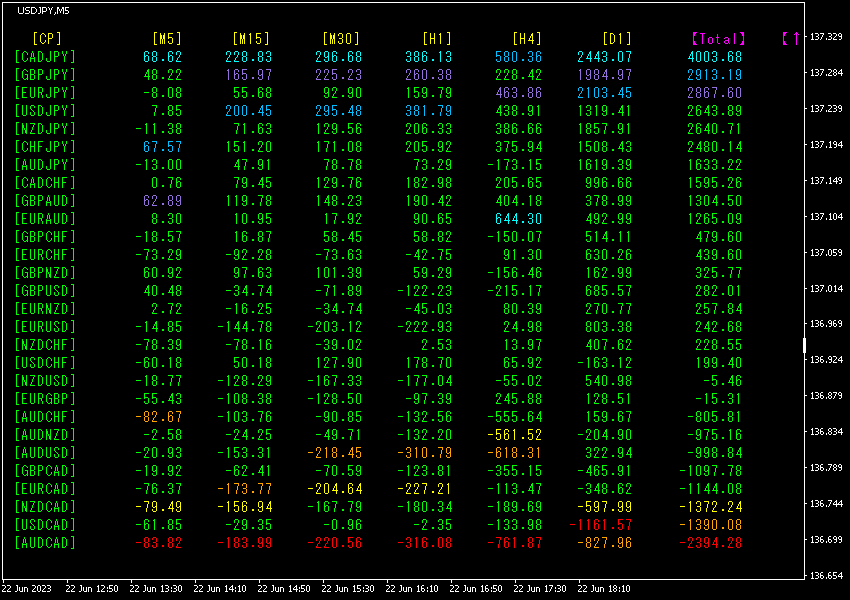 Total数値の降順に並び替えています。一番上の行のCADJPYは、全時間足で水色表示になっていて、Total数値が4003.68と極端に大きな数字になっています。CADJPYに大きな上昇トレンドが発生しています。