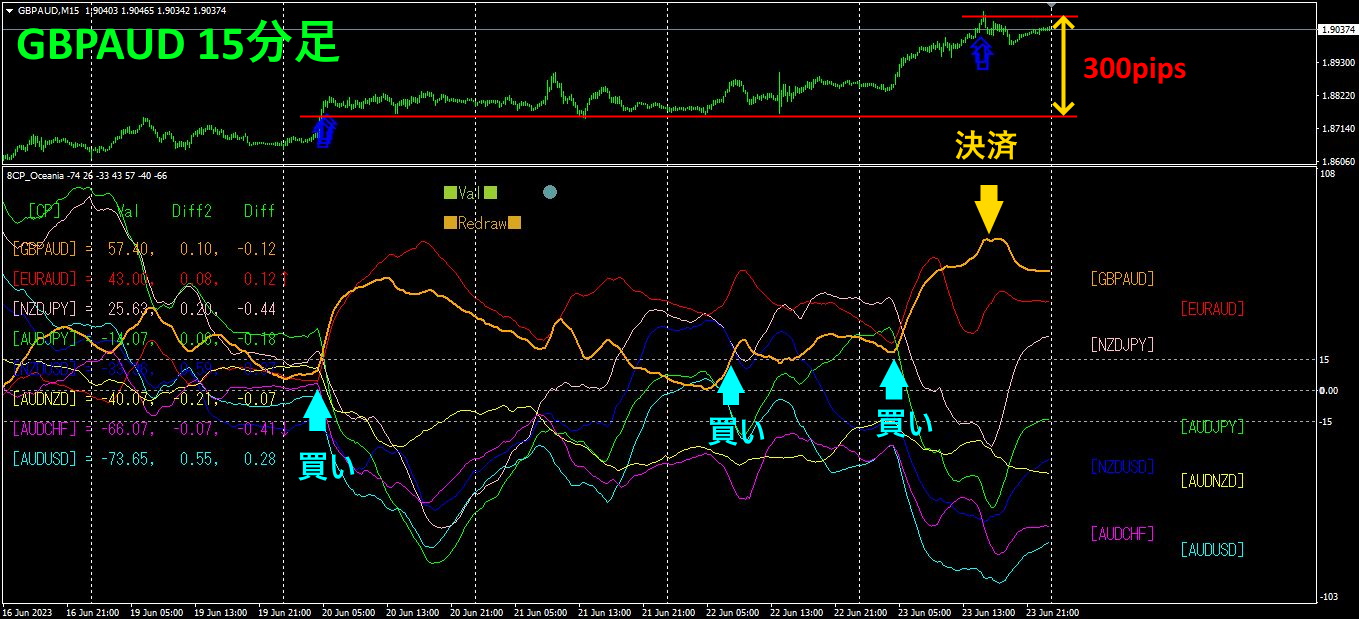 火曜日にGBPAUDが他のグラフ群を上抜けしてきたので買いエントリーしました。その後、木曜日と金曜日に買い増しを行い、週末に決済します。火曜日から週末までで、約300pipsの利益が得られました。