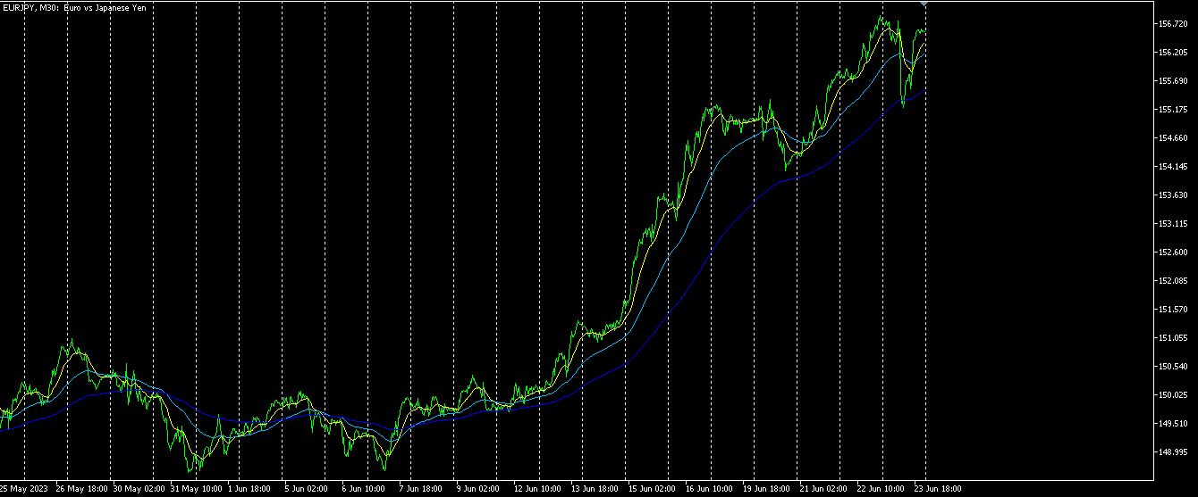 ピンク色がEUR、緑色がJPYです。JPYは下向き、EURも下向きになっています。まだJPYの下向き角度の方が、EURの下向き角度よりも大きくなっています。今後は、JPYが反転して上昇してくると考えられますので、EURJPYはやや上昇の局面から頭打ちになり、次に下降に向かうのではないかと推論しています。
