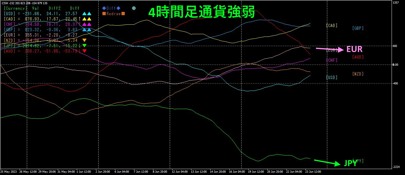 4時間足の通貨強弱チャートです。