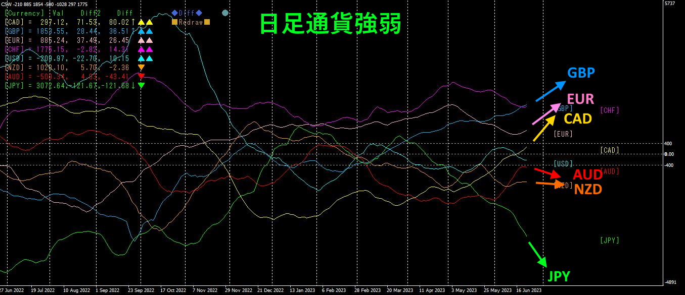 CAD、GBP、EUR、CHFが上を向いています。一方、JPY、AUD、NZDは下を向いています。CADが最も強く上昇、JPYが最も強く下落しています。