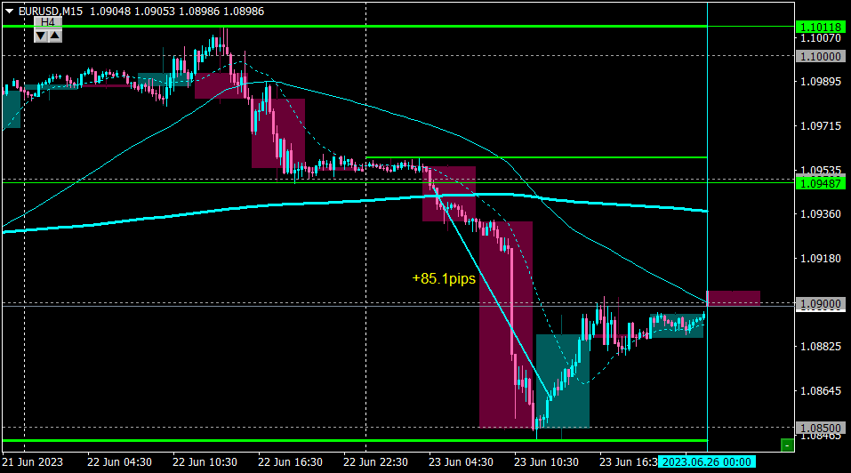 1.0850のサポート候補で反発したところでイグジット。+85pips