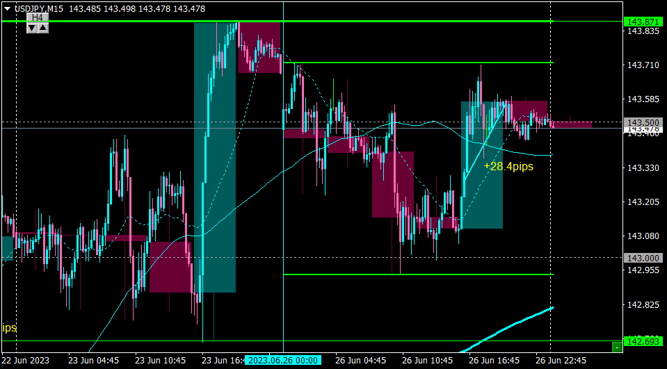 深夜までホールドしたが、前日高値を上抜ける様子がなかったのでイグジット。+28pips