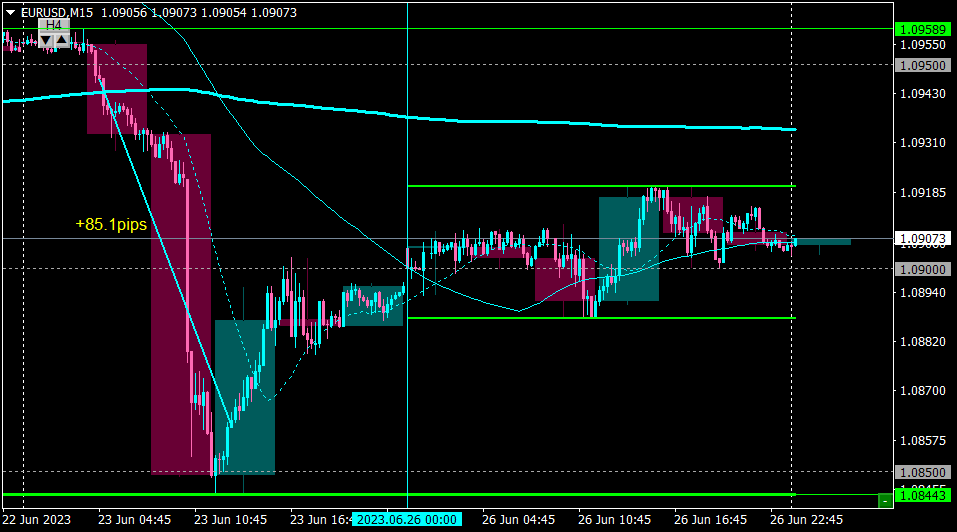 〇前日のトレード・USDJPY ドル円(15分足)昨日は先週安値141.50付近での値動きにとどまったためノートレード。・EURUSD ユーロドル(15分足)昨日は1.090付近でのプライスアクション