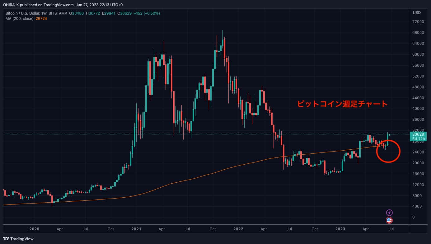 週足チャートを見てみると、200日移動平均線上で価格が踏みとどまっている上に見えます。