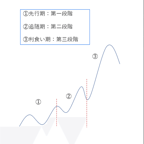 景気改善など、ファンダメンタルズの買い要素が確認されて、多数の投資家が参入し、価格が急伸する時期です。