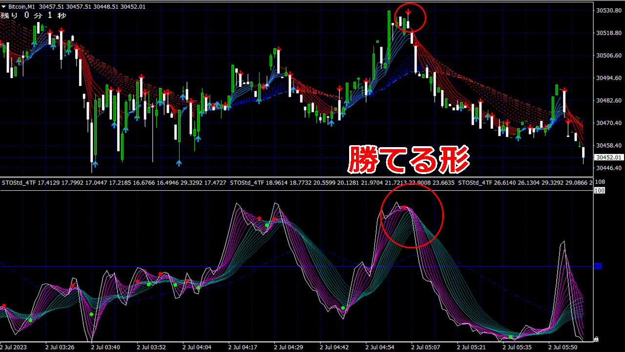 ② 矢印サイン点灯状態で、インジケーターのピンク色の帯が、緑の帯を下からすくい上げるような形状であれば、現在のローソク足が確定する数秒前か確定の直後に1分判定または3分判定でハイエントリーします。