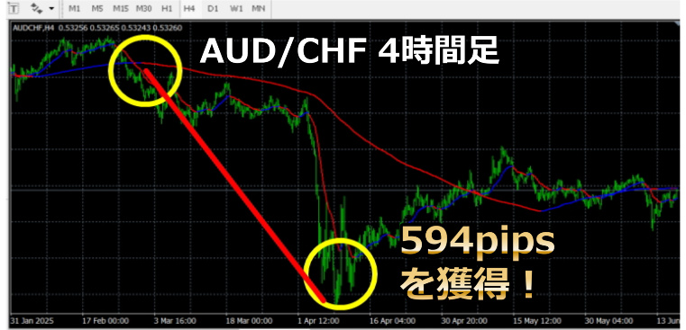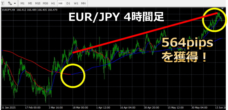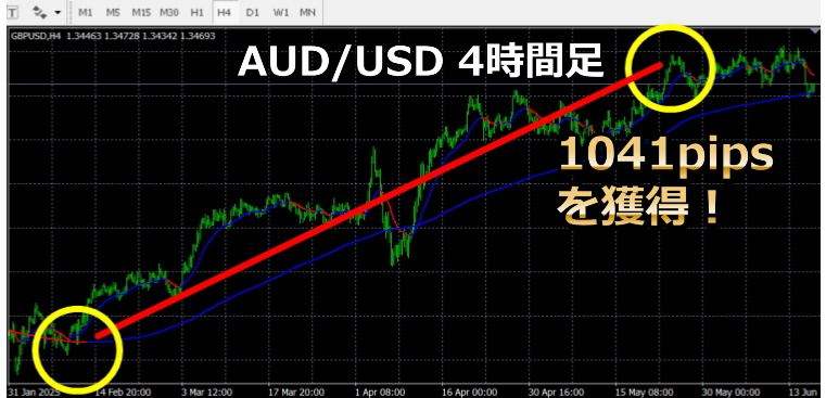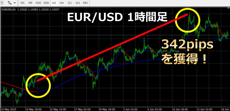 「最強の移動平均線インジケーター」は、2つの線の色が揃った時にエントリーで大きくpipsが取れます!