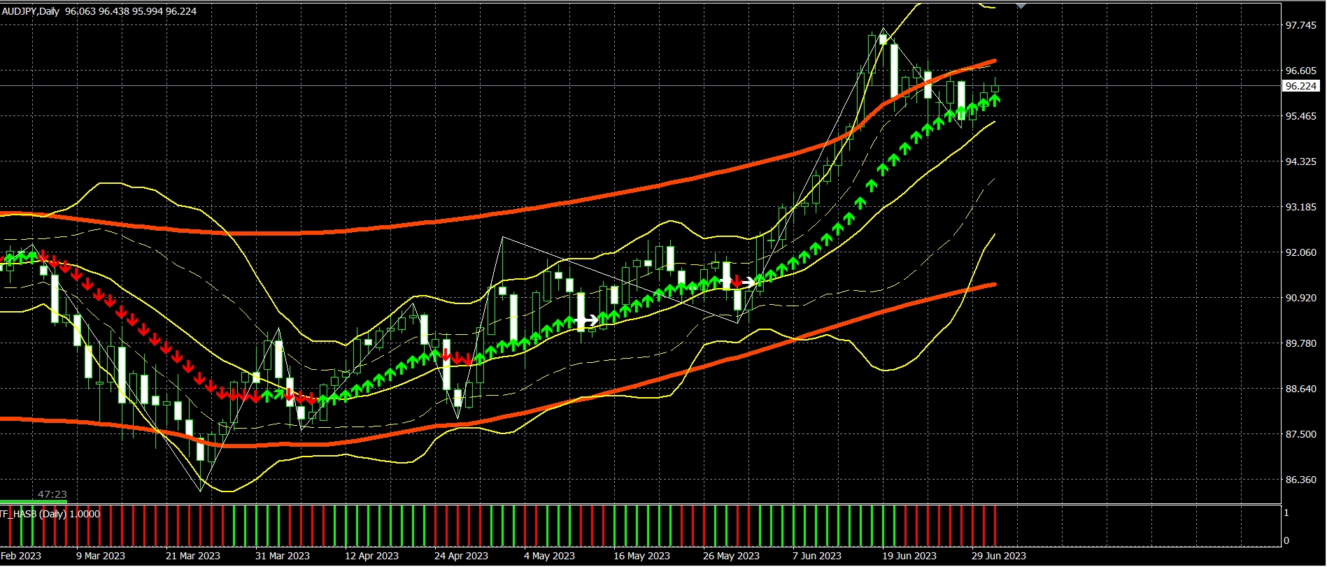 豪ドル円は買い逆指値96.55がヒットし買いポジションとなっております。