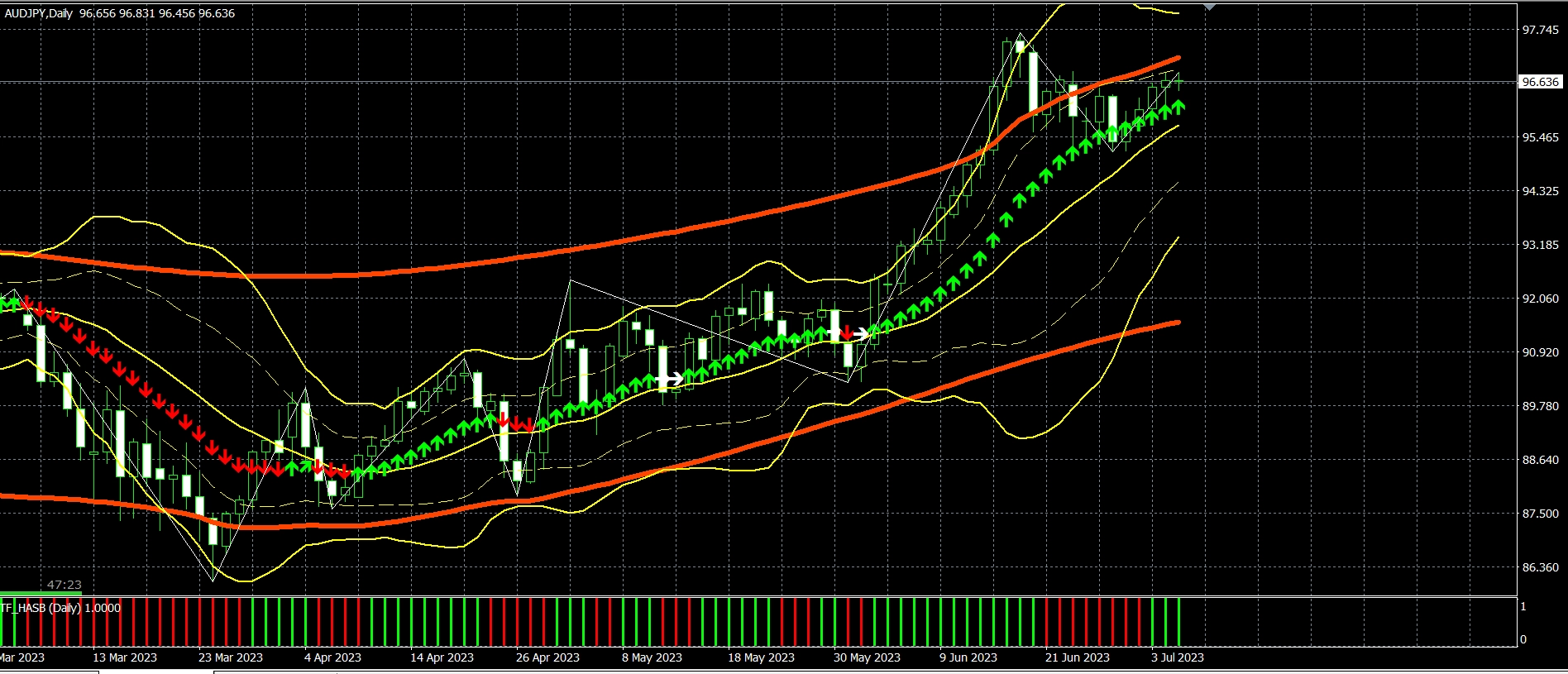 豪ドル円は買いポジションがストップロス96.05にかかり-50pipsとなりました。