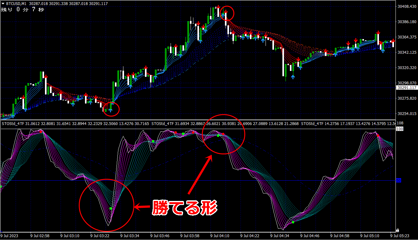 ② 矢印サイン点灯状態で、インジケーターのピンク色の帯が、緑の帯を下からすくい上げるような形状であれば、現在のローソク足が確定する数秒前か確定の直後に1分判定または3分判定でハイエントリーします。