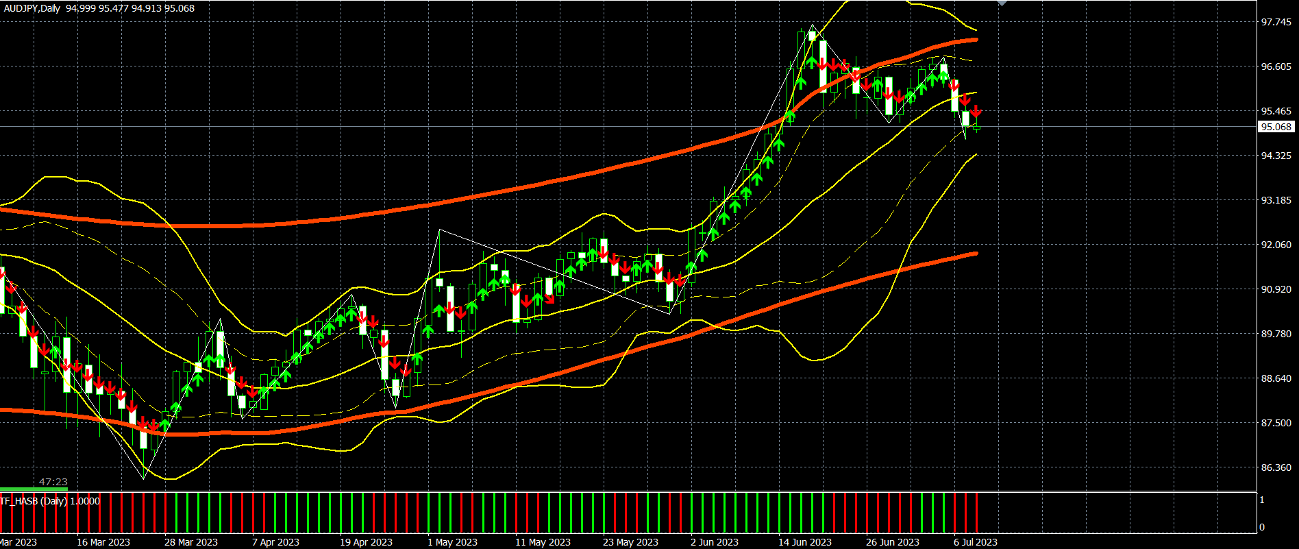 ドル円は買いポジションがリミット141.00を達成し+95pipsとなっております。豪ドル円は買いポジションを昨日4時間足18時の終値95.75で決済し+40pipsとなっております。
