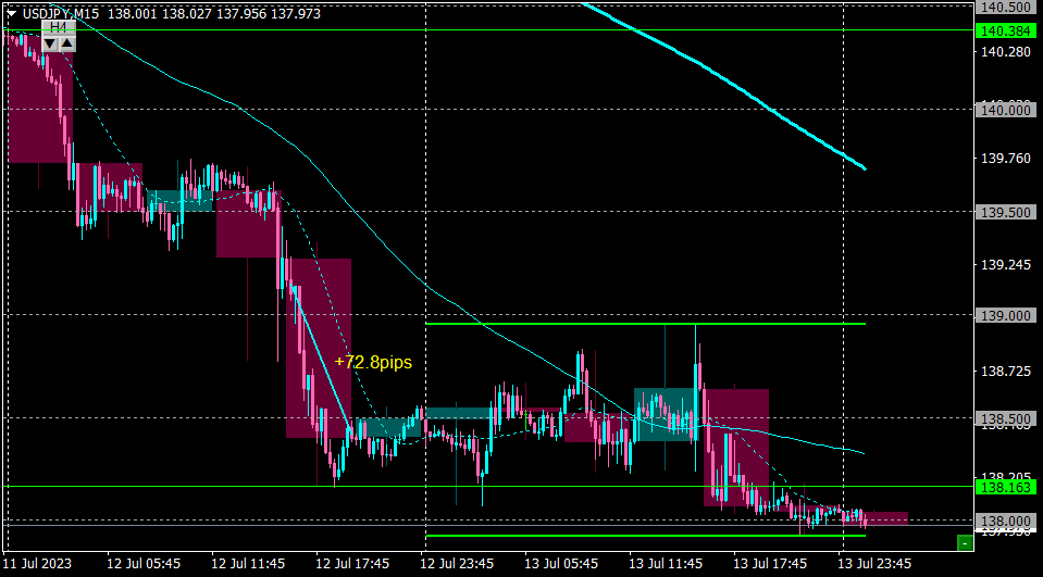 〇前日のトレード・USDJPY ドル円(15分足)昨日は前日安値を割り込んだタイミングでショート。夜までホールドしM15レベルのダウが変わったタイミングでイグジット。+61pips・EURUSD ユー
