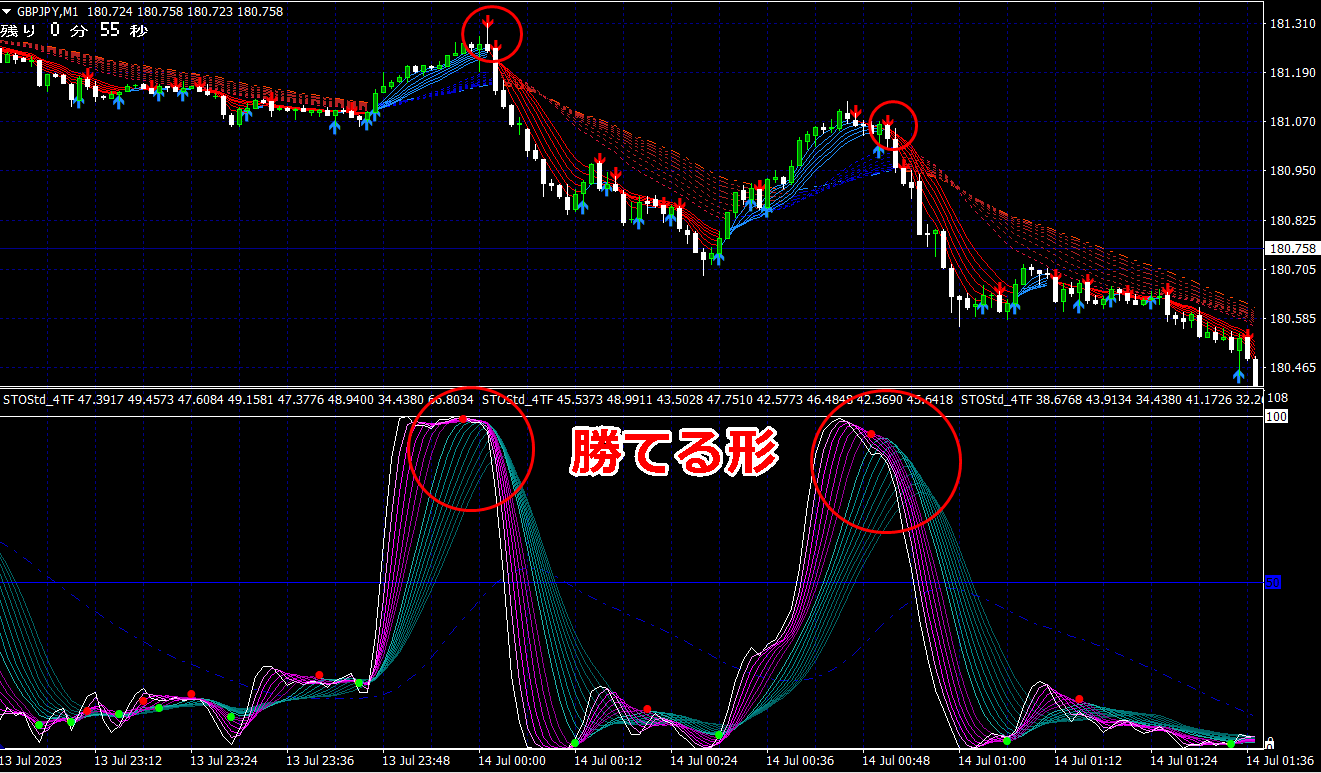 ② 矢印サイン点灯状態で、インジケーターのピンク色の帯が、緑の帯を下からすくい上げるような形状であれば、現在のローソク足が確定する数秒前か確定の直後に1分判定または3分判定でハイエントリーします。