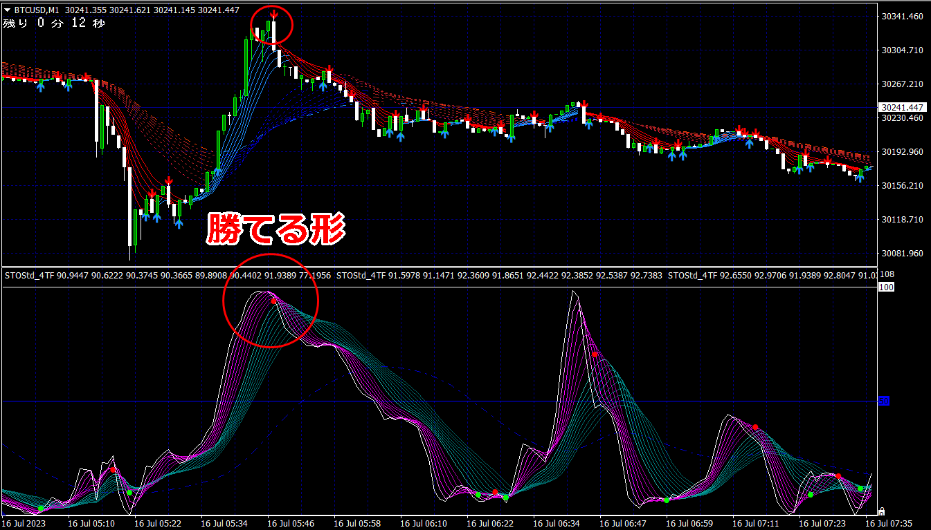 ② 矢印サイン点灯状態で、インジケーターのピンク色の帯が、緑の帯を下からすくい上げるような形状であれば、現在のローソク足が確定する数秒前か確定の直後に1分判定または3分判定でハイエントリーします。