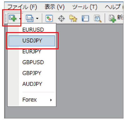 ツールバーの緑色の「+」ボタン→通貨ペアを選ぶ(またはメニューバーの「ファイル」→「新規チャート」→通貨ペアを選ぶ)