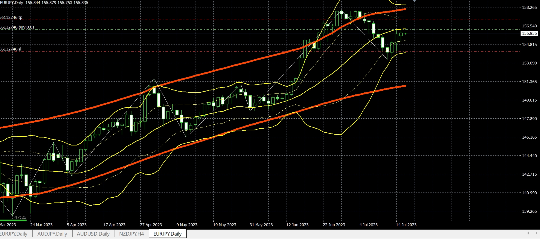 ドル円は買いポジションがリミット141.00を達成し+95pipsとなっております。豪ドル円は買いポジションを昨日4時間足18時の終値95.75で決済し+40pipsとなっております。