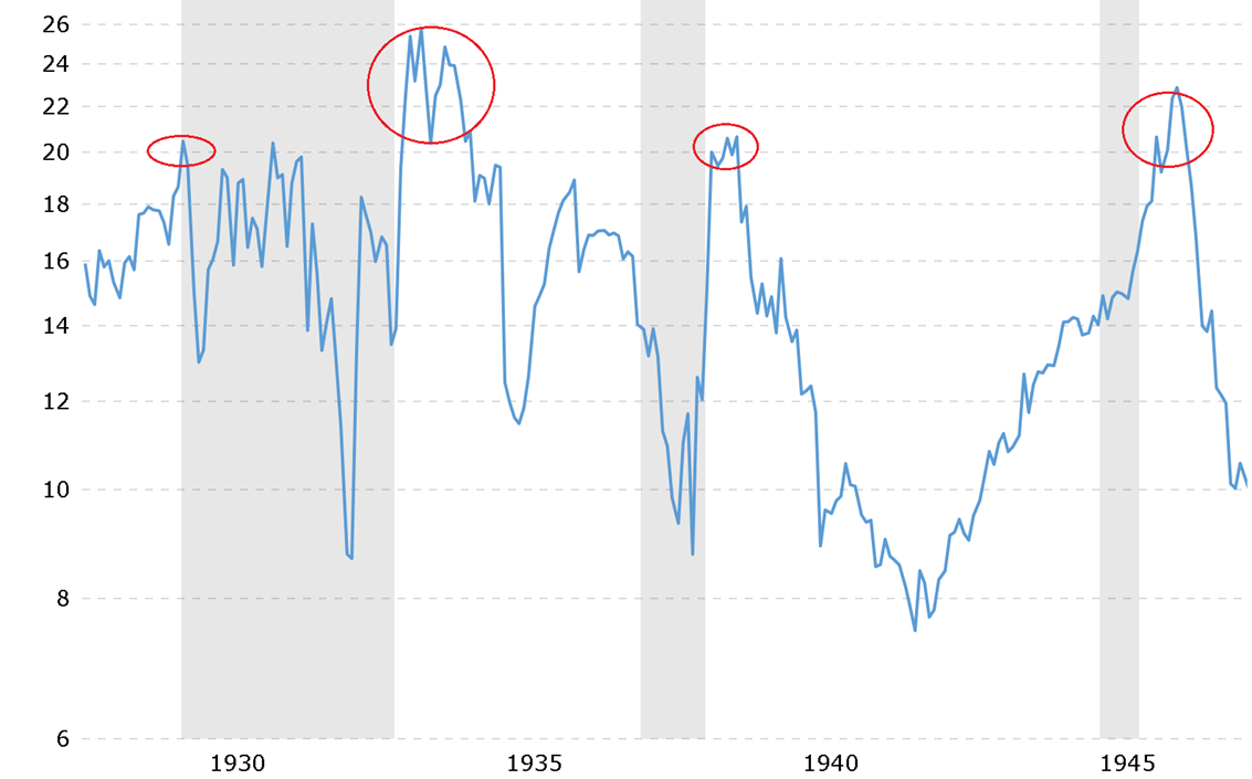 1929年の米国大恐慌直前の大天井における米株のPER(株価収益率、株価を一株当たりの利益(EPS)で除するもの)が僅か20.46倍―と知れば、驚く人は多いのではないか。