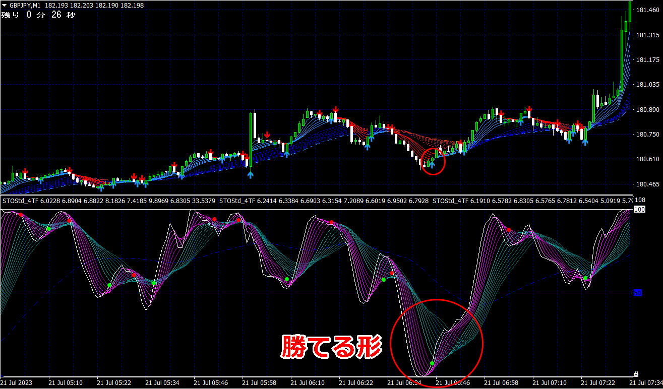 ② 矢印サイン点灯状態で、インジケーターのピンク色の帯が、緑の帯を下からすくい上げるような形状であれば、現在のローソク足が確定する数秒前か確定の直後に1分判定または3分判定でハイエントリーします。