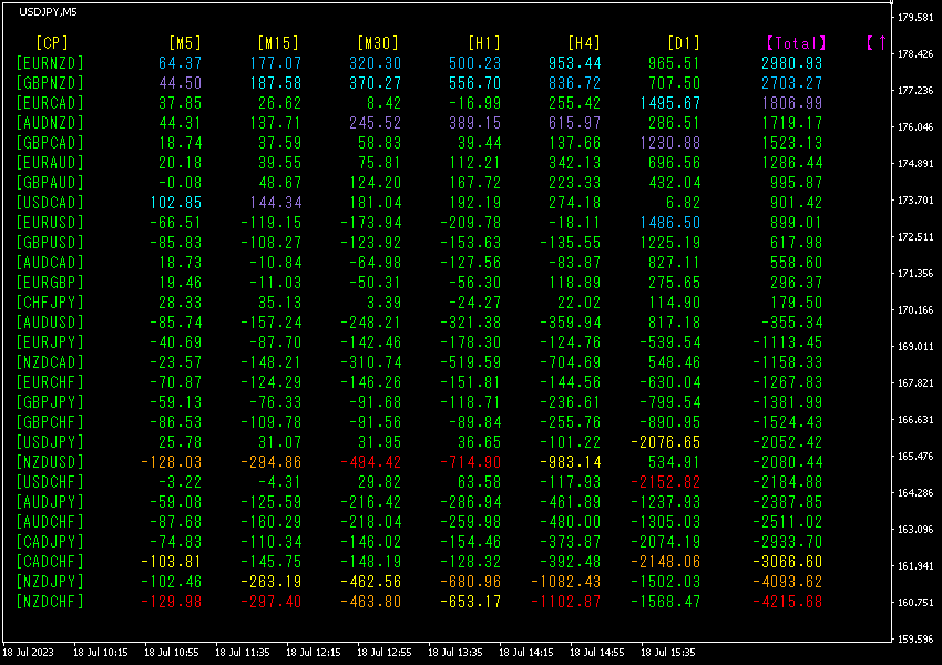 Total数値の降順に並び替えています。一番下の行のNZDCHFは、[D1]を除く全時間足で赤系の表示色になっていて、Total数値が-4215.68と大きなマイナスの数字になっています。NZDCHFに大きな下降トレンドが発生していることを示しています。